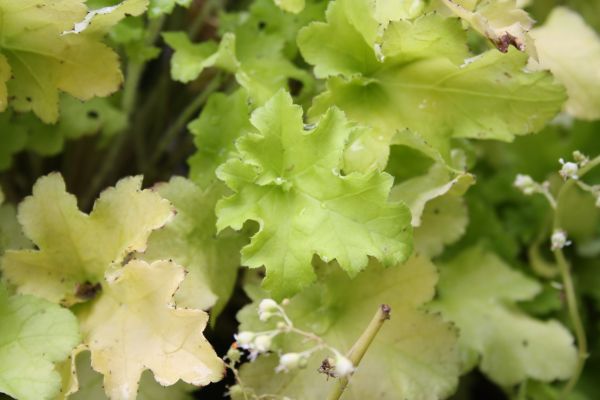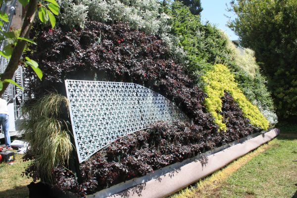 Three of the sections are covered with a mix of 3,000 evergreen leaves and flowers inserted into recycled fleece fabric stapled to a PVC board that is bolted to the aluminum walls. Most of the metal is exposed as a visual element for the fourth wall. It features discarded, small steel pans serving as “drums,” stamped steel automotive scrap repurposed into decorative metal screens, and suspended cross cutouts – made of metal waste – that chime when moved by the wind.