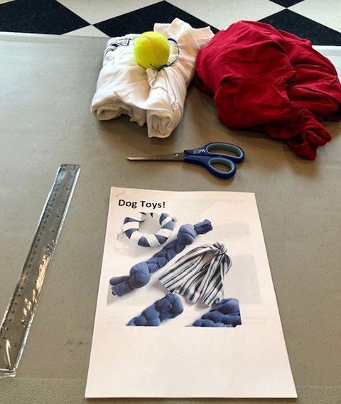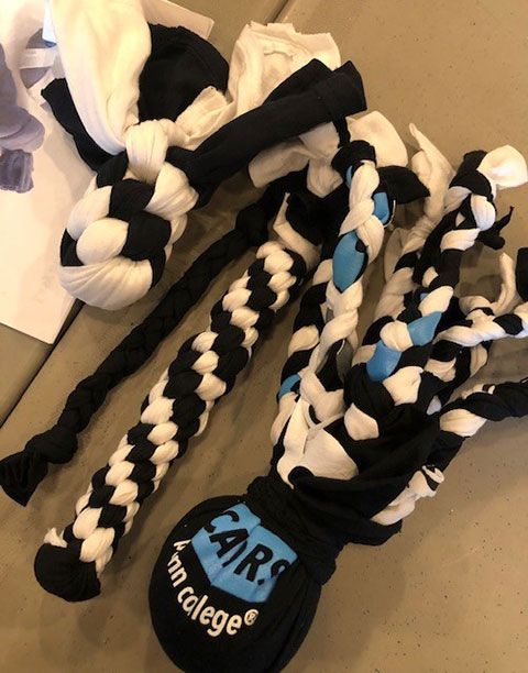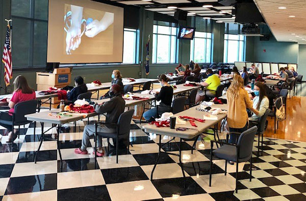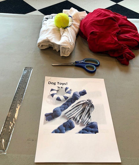 Seventeen service-driven Penn College students, many of them representing campus organizations, took part in the Office of Student Engagement's recent "(community) Service Saturday" in Penn’s Inn. "We made dog toys from T-shirts and dog-friendly tennis balls using a 'recipe' packet I compiled and watching YouTube video tutorials," said Shannon L. Skaluba, student organization and information center specialist, who facilitated the Sept. 12 activity (and provided the accompanying photos). "Many learned how to tie square knots during the event, an essential skill in making homemade dog toys. We had a great time!" The box of toys fashioned by the properly masked and socially distanced group will be donated to the Lycoming County SPCA. "(community) Service Saturday" events, held the second Saturday of the month, provide Penn College students with opportunities to volunteer within the Greater Williamsport area. The next will be held from 9-11 a.m. Oct. 10, when participants will clean up off-campus neighborhoods and Ways Garden. All