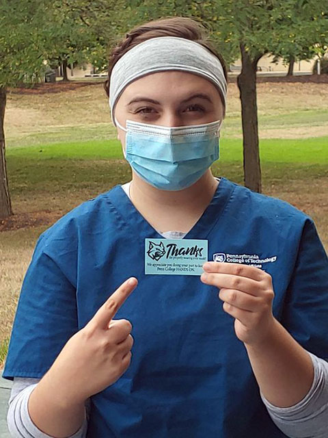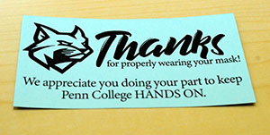 Adherence to Penn College's COVID-19 guidelines, particularly the donning of face coverings, is paying off for several students.Under an incentive program overseen by the Office of Student Engagement, students may be handed a card for properly wearing their masks while walking across campus. Each of those students is asked to fill out the back of the card and return it to the Bush Campus Center Information Desk to be entered into monthly prize drawings.