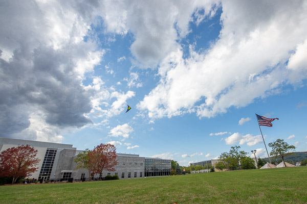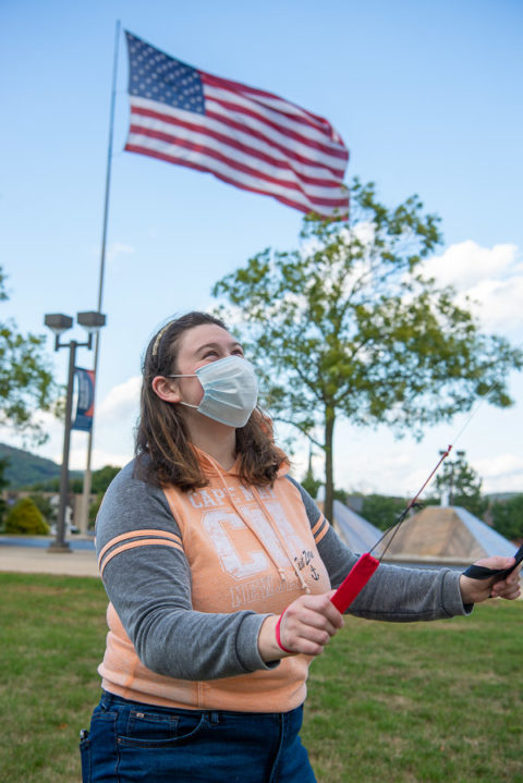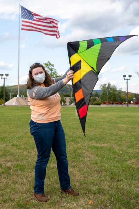 Forest technology student Lyssa C. Burke took advantage of Wednesday afternoon’s wild winds to fly a stunt kite on the Madigan Library front lawn. A native of Montana, Burke grew up in Idaho and moved to Williamsport a few years ago with her mother; together, they enjoy the great outdoors. Burke’s hobbies also include photography, fishing, skiing, writing and drawing her many characters. (“I never leave home without a sketchbook,” she said.) Burke enrolled at Penn College after enjoying its Autism Spectrum Post-Secondary Interest Experience in the summer of 2018. Through ASPIE, she says she found a supportive environment with the help of the college’s Connections Links (student orientation leaders) and Dawn M. Dickey, director of disability services, who continues to assist Burke in her college experience. Also in high school, Burke engaged in the Wildlife Leadership Academy as a student and a team leader. Based in Lock Haven, the academy aims to empower high school youth to become conservation ambassadors. With the goal of becoming a game warden or conservation officer, Burke says enrolling in Penn College’s forest technology major (and a criminology course) offers an ideal path to her dream occupation.