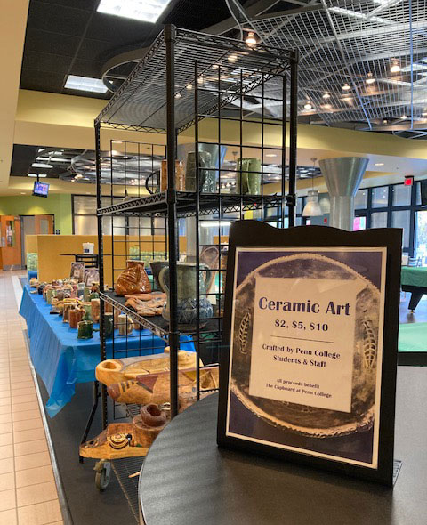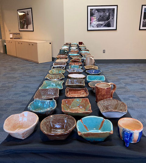 Dining Services held its third annual Soup for the Soul event on Thursday, raising more than $1,100 to benefit The Cupboard. For an $8 donation, participants chose a handcrafted bowl and enjoyed a meal of chicken tortilla or cheddar broccoli soup, roll, dessert and beverage. A ceramic art sale was held in conjunction with the benefit meal, featuring such items as mugs, pitchers, wall hangings and tiny statues. Bowls and art pieces were made and donated by instructor David A. Stabley and students in his ceramic and wood sculpture classes. For more information on the food pantry, housed on the first floor of the Bush Campus Center (Room 105H, at the rear of CC Commons), email The Cupboard or visit the Dining Services portal page.Photos by Noelle B. Bloom, assistant director, Dining Services
