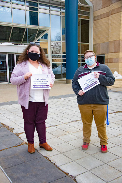 Penn College celebrated International Women's Day on Tuesday, joining the global recognition of the social, economic, cultural and political achievements of women. Members of the campus community were invited to stop by the Breuder Advanced Technology & Health Sciences Center patio to take selfies, enjoy sweet treats and express how they #ChooseToChallenge for equality. The event was sponsored by the Office of Student Engagement as part of the observance of Women's History Month, which will include an Iconic Women's Painting Party from 3 to 5 p.m. Monday, March 22, on the Bush Campus Center patio; and a virtual Awesome Women Exemplars induction ceremony, set for Wednesday, March 24, on the Student Life Facebook page.Photos by Juvy A. Orillaza, student photographer