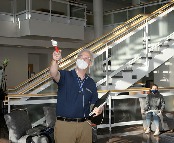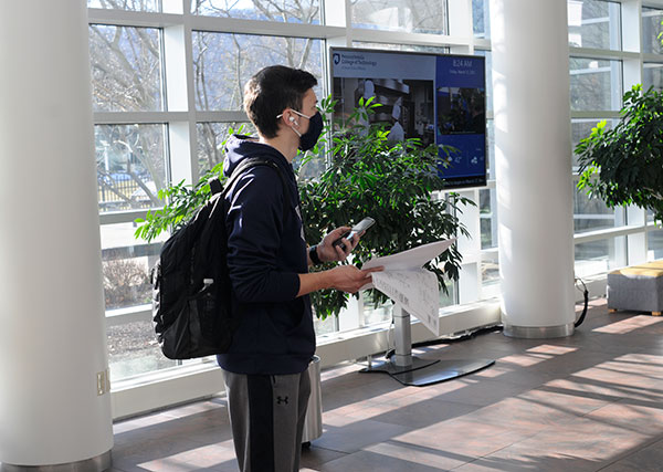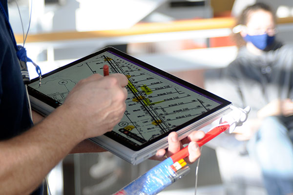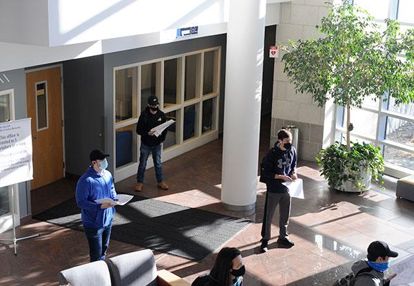 Students in Drew R. Potts' Structural Steel Design class got a unique look at one of the academically advantageous areas in which Penn College has major bragging rights: the real-world credibility of its faculty members. Among his positions before joining the college family in 2008, Potts worked as an engineering manager and as a design engineer for a steel fabrication facility ... and among the projects on which he worked was the college's Student & Administrative Services Center, constructed in 2002 and dedicated the following February. The class convened Friday morning in the SASC lobby, where – distanced by necessity and connected by technology – they reviewed original architectural drawings and conveniently compared them to the full-size structure that rose from those blueprints. Among the life lessons imparted by Potts, an assistant professor and department head for civil engineering and surveying technology, is the need for communication given the frequent and substantial changes that occur between groundbreaking and ribbon-cutting.