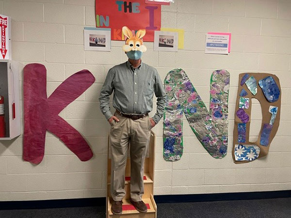 Who is that (doubly) masked man, hopping down the bunny trail, embracing a sentiment that transcends holidays? It's Tom Zimmerman, associate professor of psychology – typically friendly and pandemically conscientious – stopping by the Dunham Children's Learning Center hallway to punctuate a timeless message.Photo by Darlene A. Warner, CLC secretary