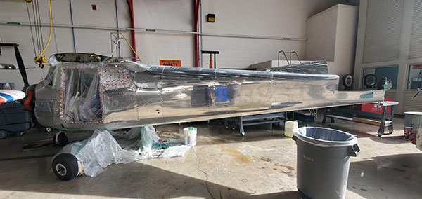 “We put that on and let it sit for a couple of hours, sometimes overnight, and that chewed up the paint and brought it into a big, gooey ball,” she recalled. “Then we just scraped it all off, and that brought it down to bare metal. Once all the paint was completely removed from the flight surfaces and the fuselage, I went in there with sandpaper and a little Jitterbug sander and got rid of all the corrosion so that there was only clean metal.”