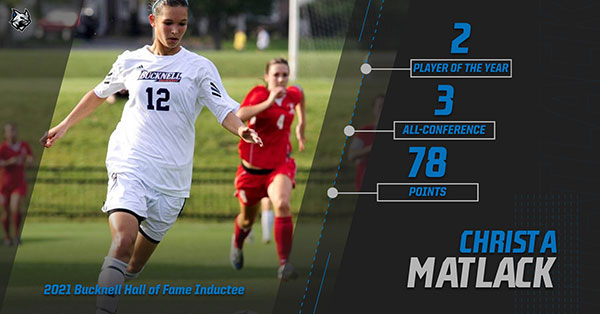 Christa MatlackMatlack, a 2011 alumna of Bucknell University, earned a Hall of Fame nod in her first year on the ballot. One of the most prolific scorers in Bucknell women's soccer history, she was the 2009 and 2010 Patriot League Offensive Player of the Year and was a three-time First Team All-Patriot League honoree.