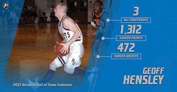 Geoff HensleyHensley, a 2006 graduate of Norwich University, led its men's basketball program to back-to-back Great Northeast Athletic Conference Tournament titles in 2005 and 2006. He scored over 1,000 career points and was named to the GNAC All-Conference First Team three years in a row. He finished 11th in the nation in 3-point percentage and 10th in the country in free-throw percentage during his senior season.