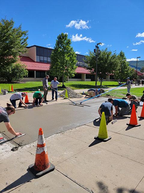 As they have done so often over the years, Penn College construction students applied their lab instruction to a real-world campus project on Wednesday. Building construction technology instructor Franklin H. Reber Jr. and students in his Concrete Construction class repaired walkways on the west side of the mall, undoing damage done when underground utilities were accessed. Reber was the driving force behind the college's two-year degree in concrete science technology, initiated in Fall 2018 as the only such program on the East Coast.