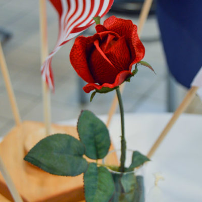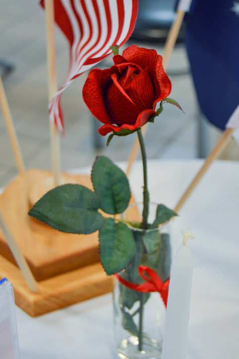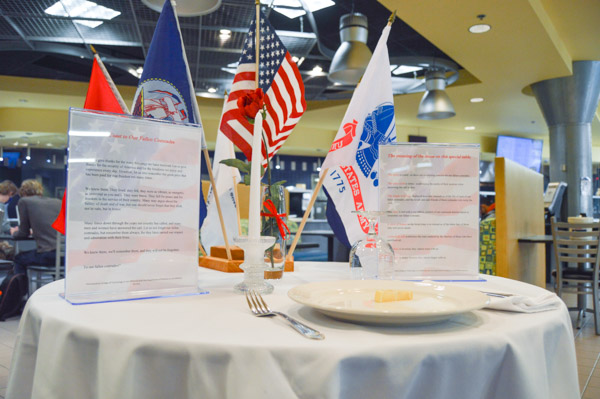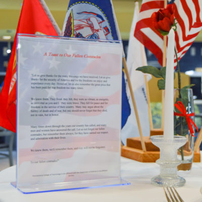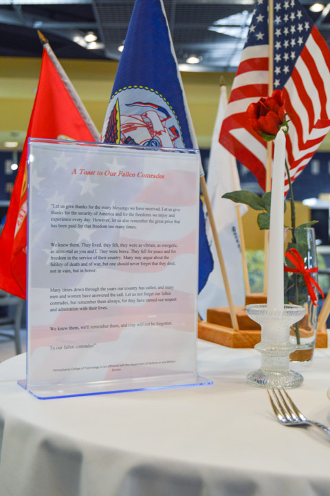 Tables, each set for one and honoring all branches of the U.S. military, have again been placed at various campus locations in honor of fallen and missing military personnel. During Penn College’s Veterans Day observance, the tables can be seen in Le Jeune Chef Restaurant, CC Commons (shown in photos), the Keystone Dining Room, Dauphin Hall, Madigan Library, and the Student & Administrative Services Center.