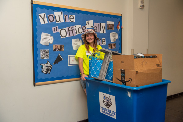 Volunteering to help move in freshmen, applied management senior Marcayla M. Lutzkanin, of Port Carbon, waits for an elevator in Dauphin Hall. Lutzkanin holds associate degrees in heavy construction equipment technology: Caterpillar equipment emphasis and diesel technology.