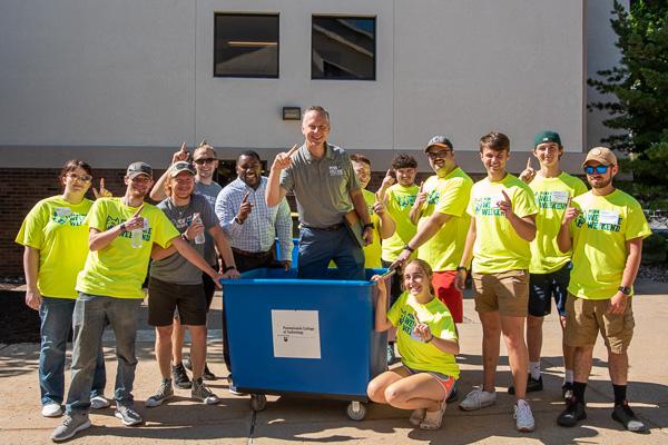 One team! Nate Woods Jr. (fifth from left), special assistant to the president for inclusion transformation, and President Reed (in bin) enjoy a photo op with members of the U-Hall Crew outside Juniata Hall.