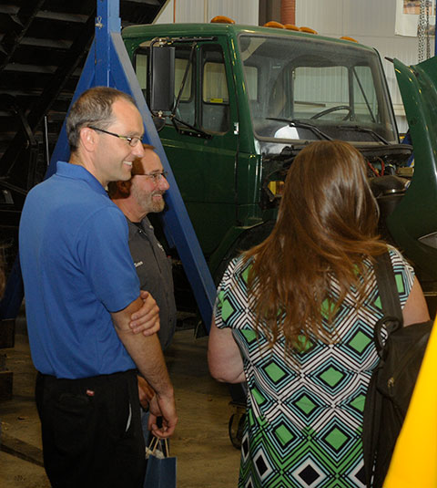 Two alumni employed by Cleveland Brothers Equipment Co. Inc. – Nathan E. Chase, a 1988 diesel mechanics graduate of Williamsport Area Community College (Penn College's immediate predecessor institution) and Joshua D. Ford, who earned an associate degree in diesel technology in 2002 – visited the Schneebeli Earth Science Center on Monday to give first-year students and seniors an exciting look at the future of the commercial trucking industry.The pair spoke to a number of classes about the Tre BEV, a battery-electric vehicle manufactured by Nikola Motor Co. and sold through Cleveland Brothers' regional dealerships. Both men are employed at Cleveland Brothers' Turbotville location: Chase as a technical communicator and Ford as a service manager. Also on hand was Randy Fetterolf, a corporate technical recruiter for Cleveland Brothers, whose frequent attendance at Career Fairs is reflective of the longtime partnership among the college and Caterpillar and its network of dealers.