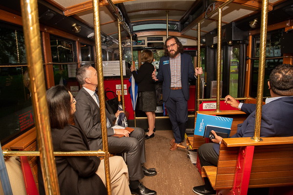 The day's drizzle was outmatched by the unstinting geniality of Bendapudi, greeting River Valley Transit employees before embarking on a trolley ride.