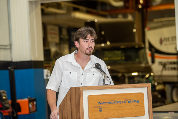 Student Ben Rich V, a recent summer intern at Foley’s Bensalem location, shared his experiences with the audience that filled the instructional space for the Corporate Partner Recognition Day – an audience that included many of his classmates, a number of Foley officials and members of Penn College’s President’s Council.