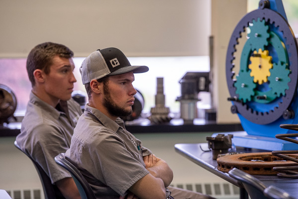 Intently listening to one of the academic presentations are Colby James McHugh (left), of Jim Thorpe, and Thad Reid Boyer, of Westfield, sporting a Foley hat he picked up when the company visited earlier this semester. Both are in their first semester of the heavy construction equipment technology: technician emphasis major.