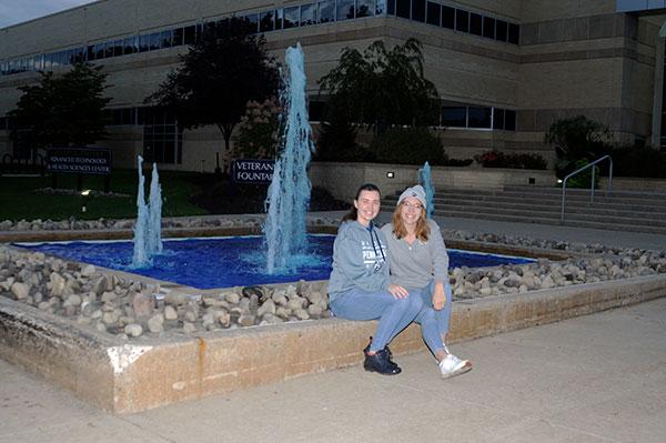 Aided by Matthew P. Barrett, an alumnus and first-shift General Services horticulturist, SGA President Sydney M. Telesky and WEB Chair Sophia G. Wiest poured dye into the fountain to lend a deep Wildcat Blue to a prominent campus centerpiece.