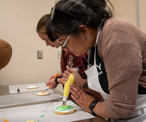 Members of Phi Theta Kappa gathered to de-stress and express their gratitude – a fitting focus for the pre-Thanksgiving (and pre-Finals) season. Led by CC Hawkins, a baking & pastry arts grad (2021), applied management student and PTK member, participants each decorated two cookies – one to eat and one to give to someone at Penn College who quietly makes a difference in their experience. Hawkins, of Williamsport, was assisted by Abby E. George, of Harrisburg, who, like Hawkins, earned an associate degree in baking & pastry arts in 2021 and is pursuing a bachelor’s in applied management, and PTK member Zak Smith, a welding & fabrication engineering technology student from West Chester. Leading the business portion of the gathering was Karen L. Avery, PTK adviser and assistant professor of biology. Phi Theta Kappa is an international honor society for students in associate-degree majors.