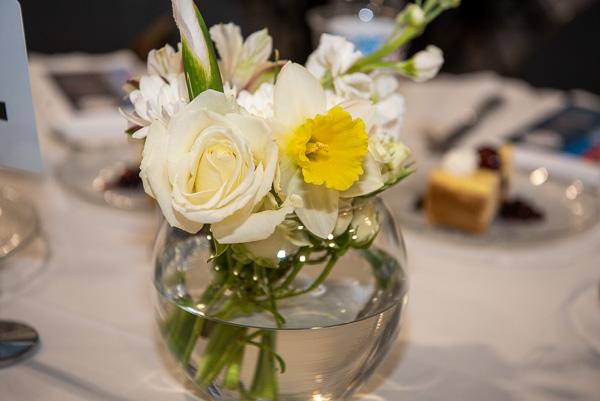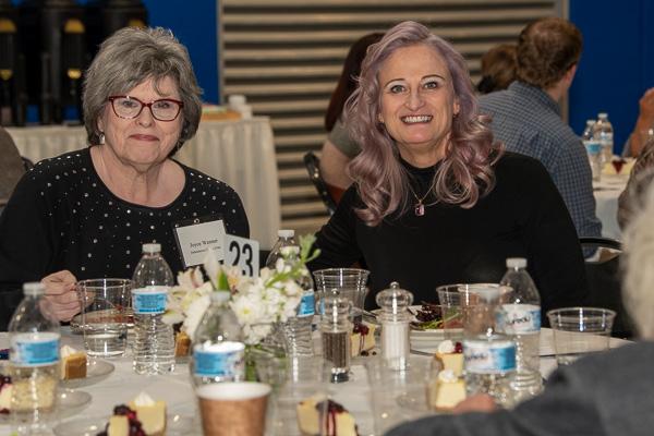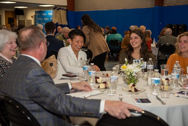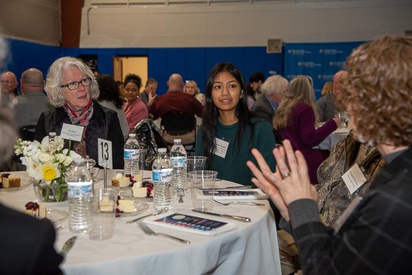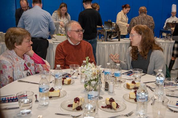 Jeffrey L. Erdly (center), a supporter of two scholarships and a 2004 recipient of Penn College's Distinguished Alumnus Award, enjoys conversation at his table with fellow guest Beth Myers (right), and Elaina M. Lawson, an architecture & sustainable design student from Erie. Erdly, a nationally renowned authority on masonry preservation technology, is co-founder of Masonry Preservation Services. He is a 1972 engineering drafting graduate of Williamsport Area Community College, a predecessor institution.