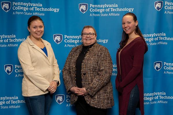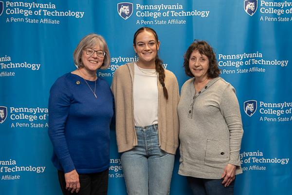 Angelica J. Parrocho (center), recipient of the Dr. Kenneth E. and Mrs. Marion C. Carl Scholarship, listens to Kimberly R. Cassel (right) talk, as Susan Best looks on. Best is one of the donors to the scholarship in honor of her parents; her father was a former president of the institution. Parrocho, of Jersey Shore, is enrolled in electronics & computer engineering technology.