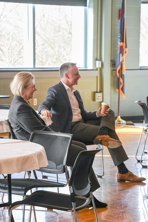 Sandra Gorka, professor of computer information technology, engages the provost.