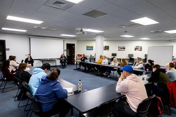 NWRC students and faculty are invited to join an Introduction to Human Services & Restorative Justice class to hear local attorney Nicole Spring (background center) speak.