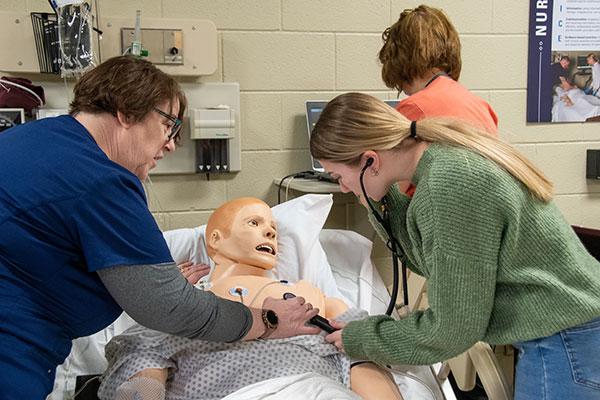 With nursing instructor Ann E. Morrison, Natalie Eckeberg-Timoney listens to the heart and lung sounds within SimMan’s chest.