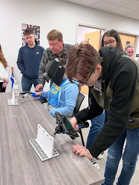 Comically pointing a rubber chicken (used as a talking piece as the visitors shared their backgrounds) is NWRC’s Stephanie McGuinness. Bláthnaid Leonard (left) and Veronica Speer (back right), a Penn College dental hygiene student from West Falls, N.Y., listen in.