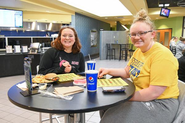 Emmalee G. Marshall (left), of Woodland, and Cameryn Sock, of Elysburg, enjoy dinner and bingo. Both are pursuing bachelor's degrees in dental hygiene.