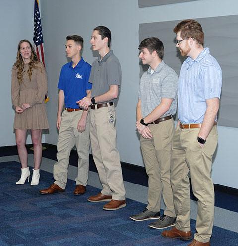 Members of this year's construction management team relive for corporate advisers their performance during national competition in Florida. From left are Danielle E. Malesky, of Biglerville; Todd I. Lavish, of Chester Springs; Conor B. Laraia, of Chambersburg; Noah H. Jumper, of Shippensburg; and Michael Messina, of Nazareth.
