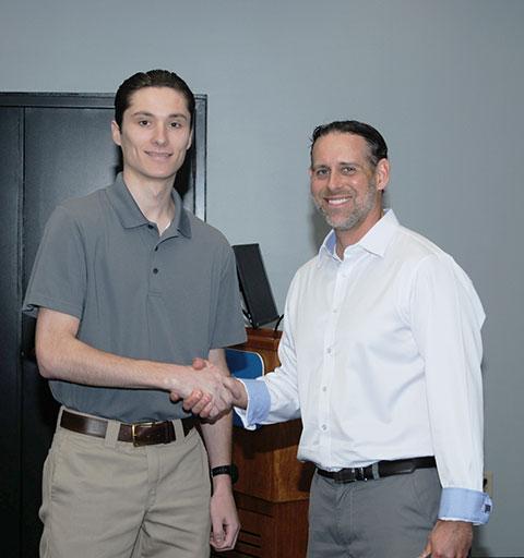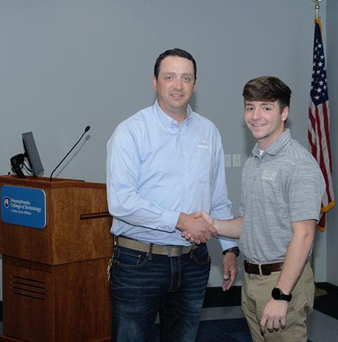 Hal Gee, vice president of energy development for Glenn O. Hawbaker Inc., awarded Jumper with a pair of $1,500 scholarships: one from the advisory committee and one from its endowment fund. Jumper additionally received a $1,000 Whiting-Turner scholarship presented by Jared Hoover, superintendent for Whiting-Turner Contracting Co. and a 2006 Penn College grad.