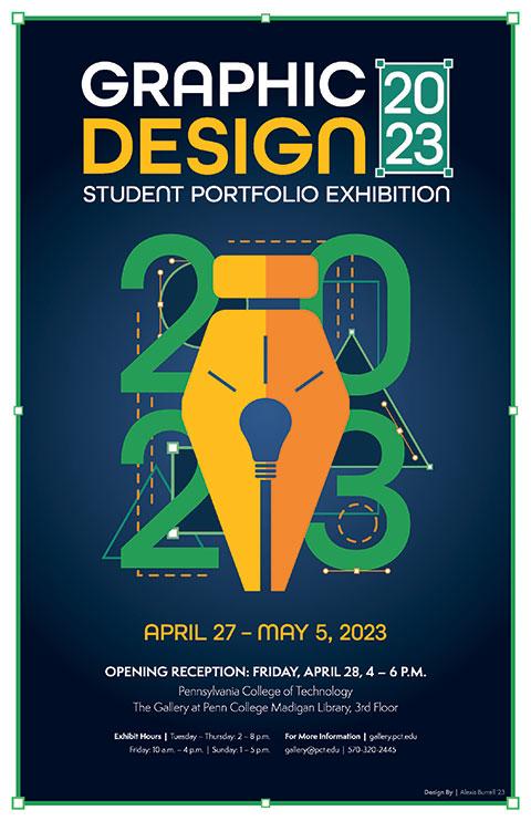 Graphic Design 2023, the annual student portfolio exhibition by graphic design seniors at Pennsylvania College of Technology, runs April 27 through May 5 in The Gallery at Penn College. The exhibition’s poster was designed by graphic design senior Alexis M. Burrell, of Danville.