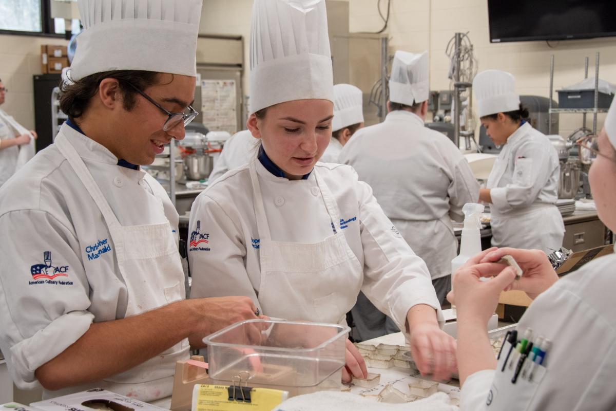 Baking & pastry arts students Destiny Y. Martinez, of Lancaster; Emily E.R. Kohen, of Mill Hall; and Amber R. Harris, of Sciota, provide a welcoming presence in a culinary lab as guests tour the facilities.