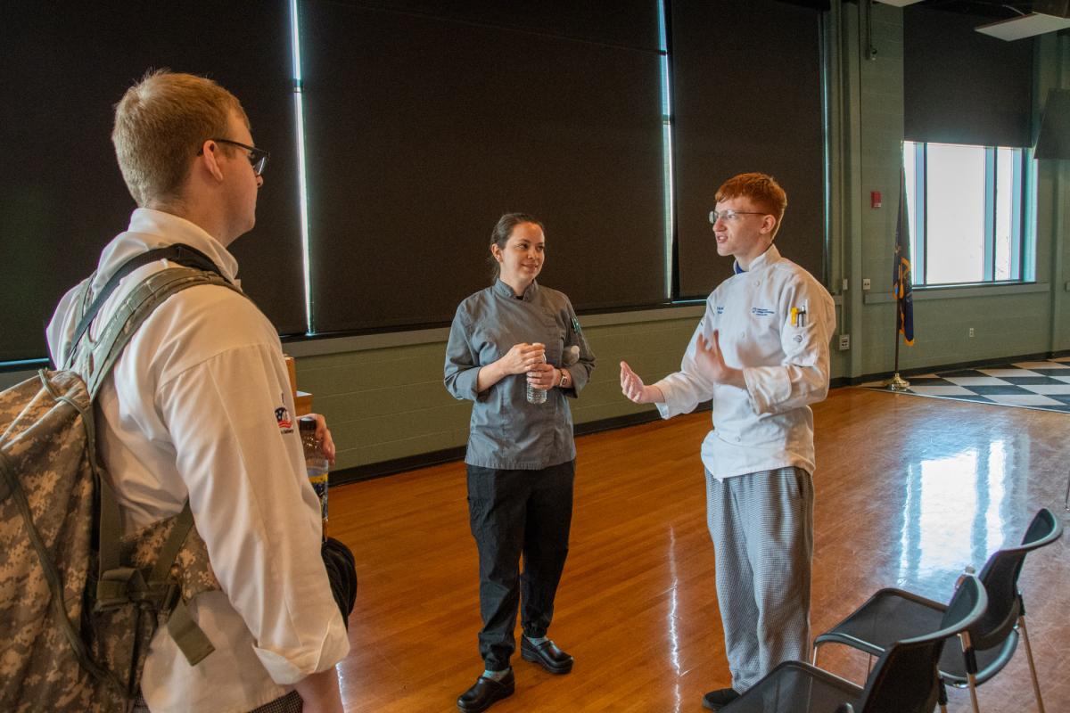 After a talk in Penn’s Inn, Wisneski answers follow-up questions with culinary arts technology students Gunner T. Vuocolo (left) of Lock Haven, and Noah W. Beck, of Port Matilda.
