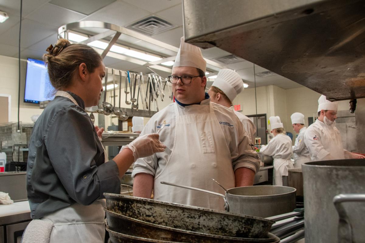 With a tasting spoon in-hand, Wisneski provides feedback to Caleb M. Taughinbaugh, a culinary arts technology student from Dover.