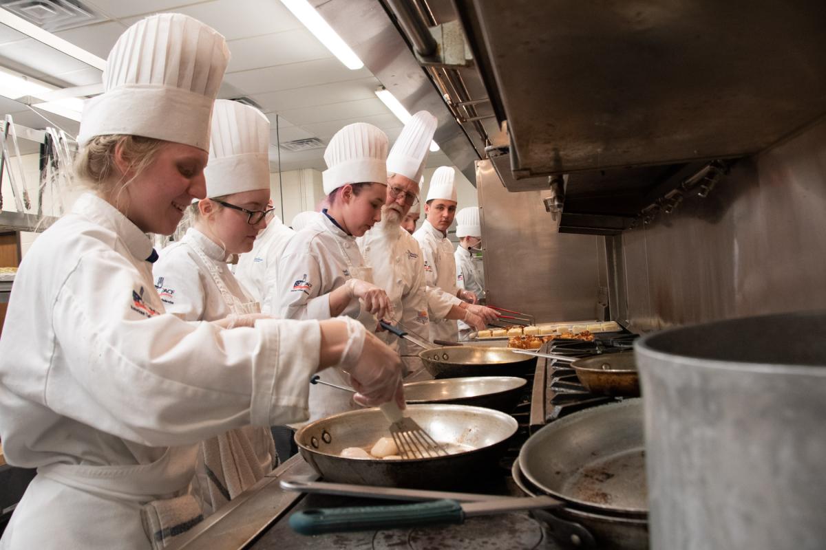 Searing scallops, under the watch of Chef Frank M. Suchwala, associate professor of hospitality management/culinary arts, are (from left): Alicia L. Walters, Osceola, culinary applications; Audrey N. Grello, State College, culinary arts technology; Maddi H. Smith, York, culinary arts technology; Suchwala; and Kade N. Chrostowski, of Moorestown, N.J. (frying potato pave), culinary arts technology and applied management.