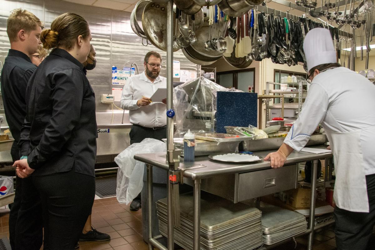 Brian D. Walton, assistant dean of business and hospitality, opens the “lineup” – during which front-of-house and back-of-house staff gather with the chefs to review the evening’s menu and order of service.