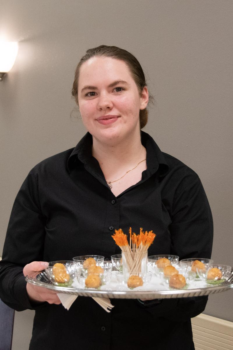 During a pre-dinner reception in Keystone Dining Room, Langendoerfer delivers one of four passed hors d’oeuvres: smoked mozzarella arancini with basil pesto.