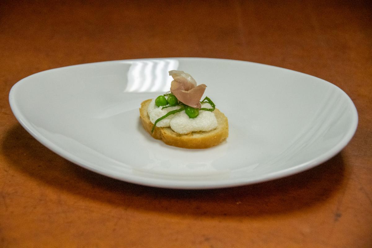 Another hors d’oeuvre offering: fresh pea and ricotta crostini with prosciutto, aged balsamic and mint