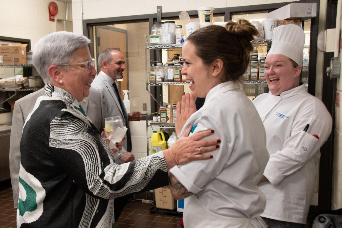 Sue L. Mayer, a retired assistant professor of baking & pastry arts/culinary arts – and a current part-time instructor – stops in to visit with her former student, Summa, in the baking lab.