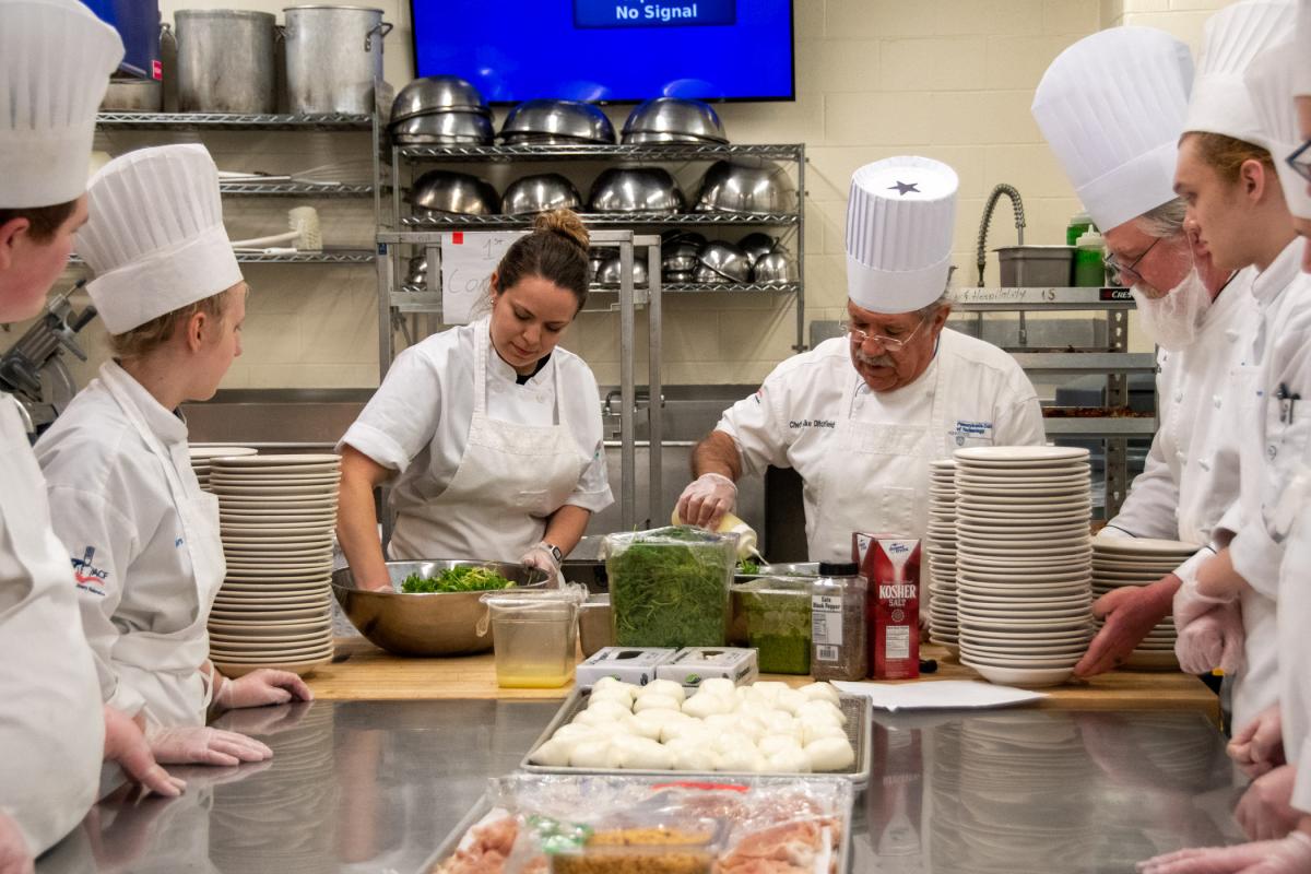 Walters joins Charlie M. Suchanec, who is chef de partie for the college’s Le Jeune Chef Restaurant, a recent graduate of the culinary arts technology major and a current applied management student, in preparing seared pork belly with soy glaze, cabbage slaw, fish sauce and vinaigrette. The appetizer was prepared and offered to guests as they toured the college’s baking and culinary labs. Suchanec is from Tyrone.