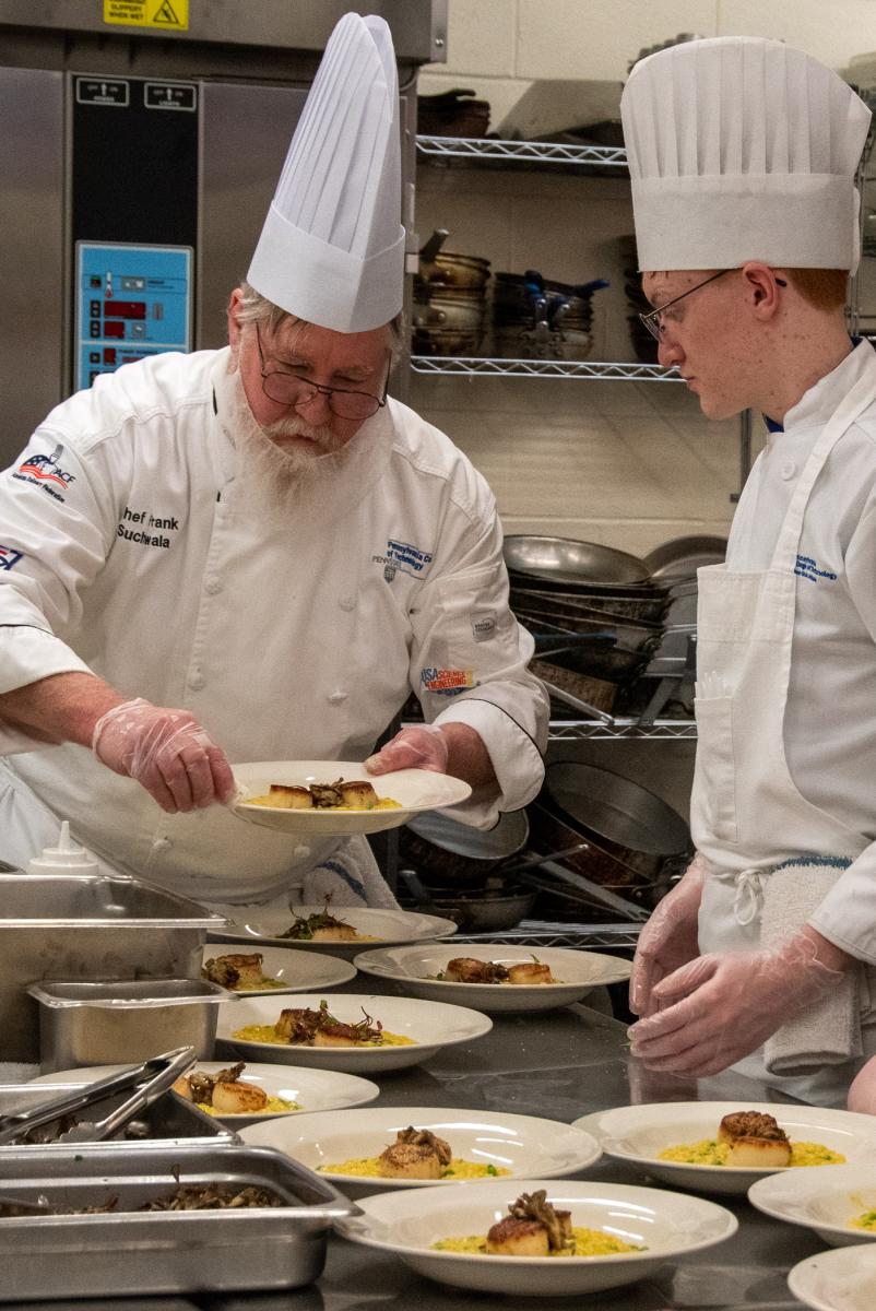 Wisneski works alongside a key mentor: Chef Michael A. Ditchfield, instructor of hospitality management/culinary arts, to toss salad greens for the first course.