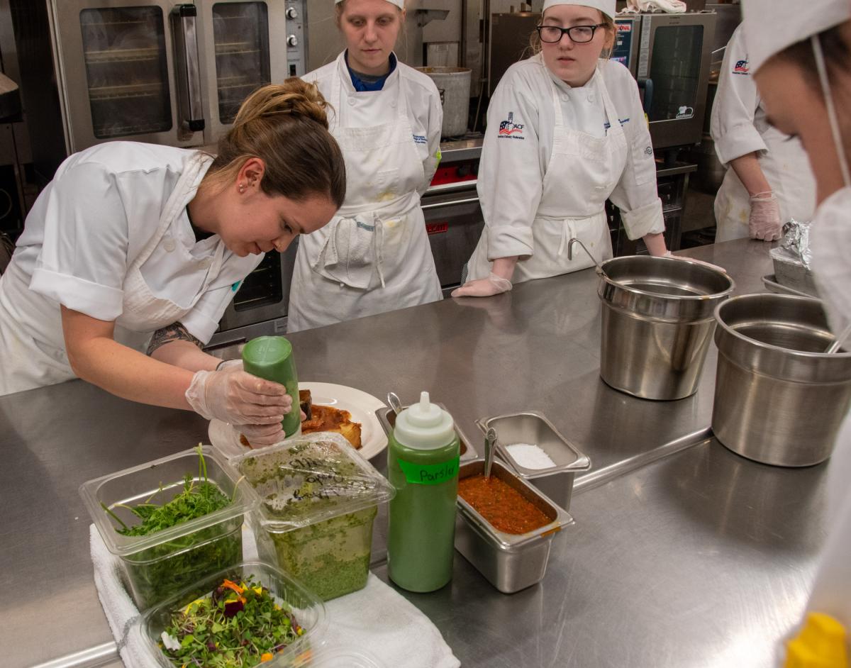 Demonstrating her main course’s plating scheme, Wisneski adds pureed parsley to a plate. Looking on are Walters (center) and Audrey N. Grello, a culinary arts technology student from State College.