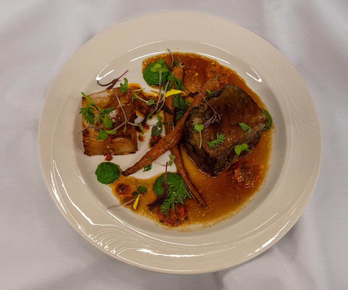 The main course: braised short rib with potato pave, cumin-and-honey baby carrots, salsa verde and adjika sauce.
