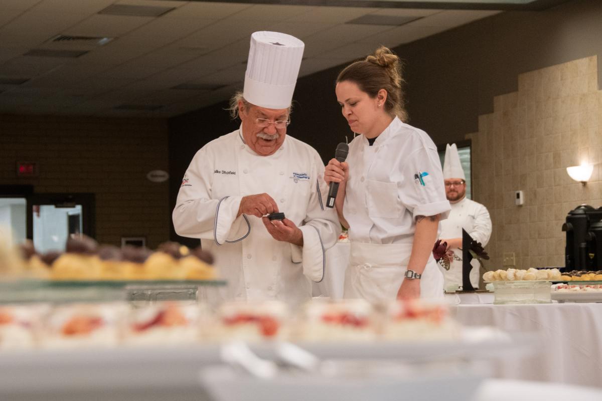 Chef Paul E. Mach, retired assistant professor of hospitality management/culinary arts, offers words of encouragement to baking & pastry arts students Autumn B. Stanley, of Lincoln University, and Macdonald. After working dozens of Visiting Chef events behind the scenes, Mach returned as a guest to enjoy the work of his former student.