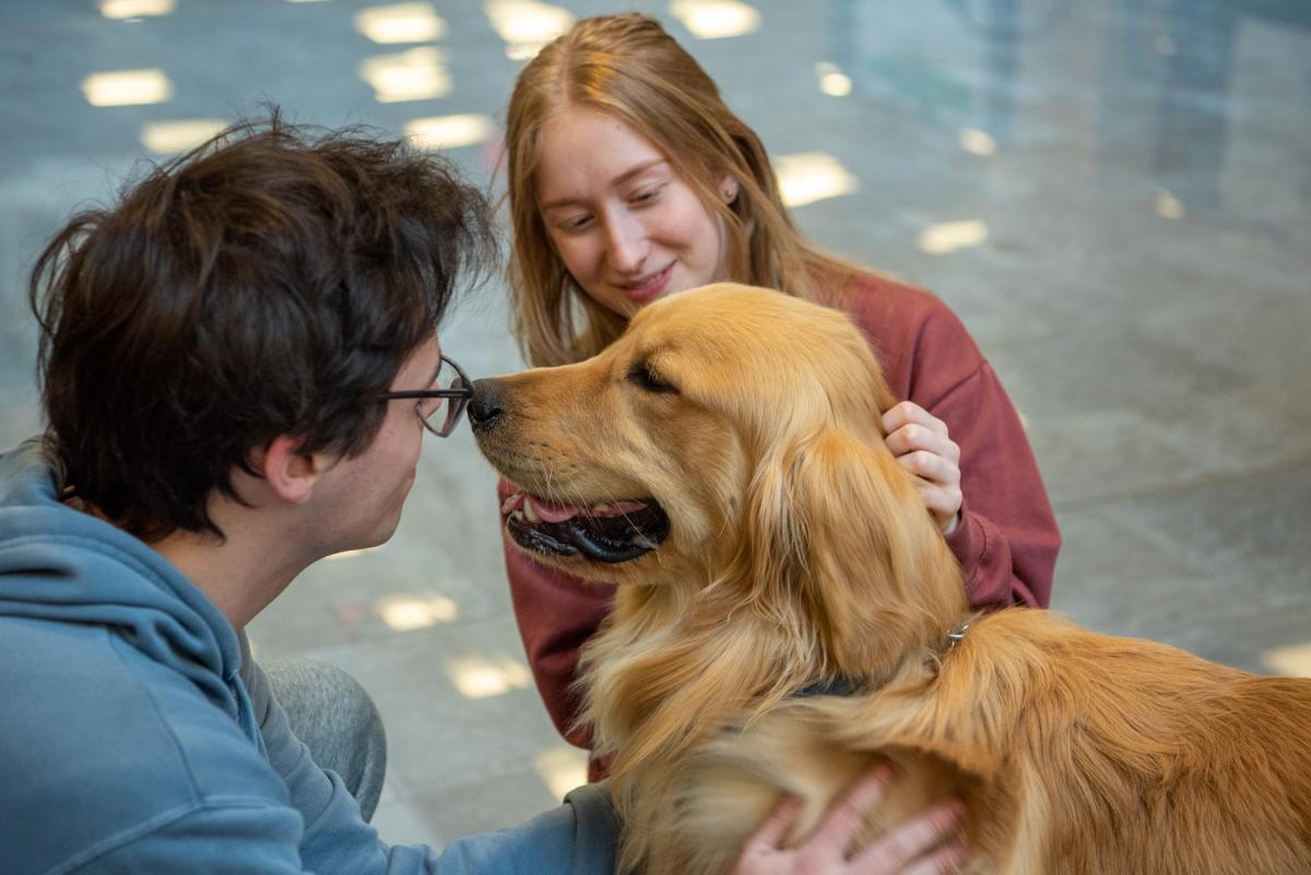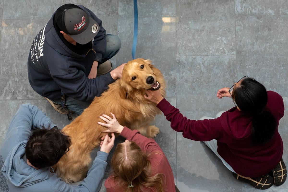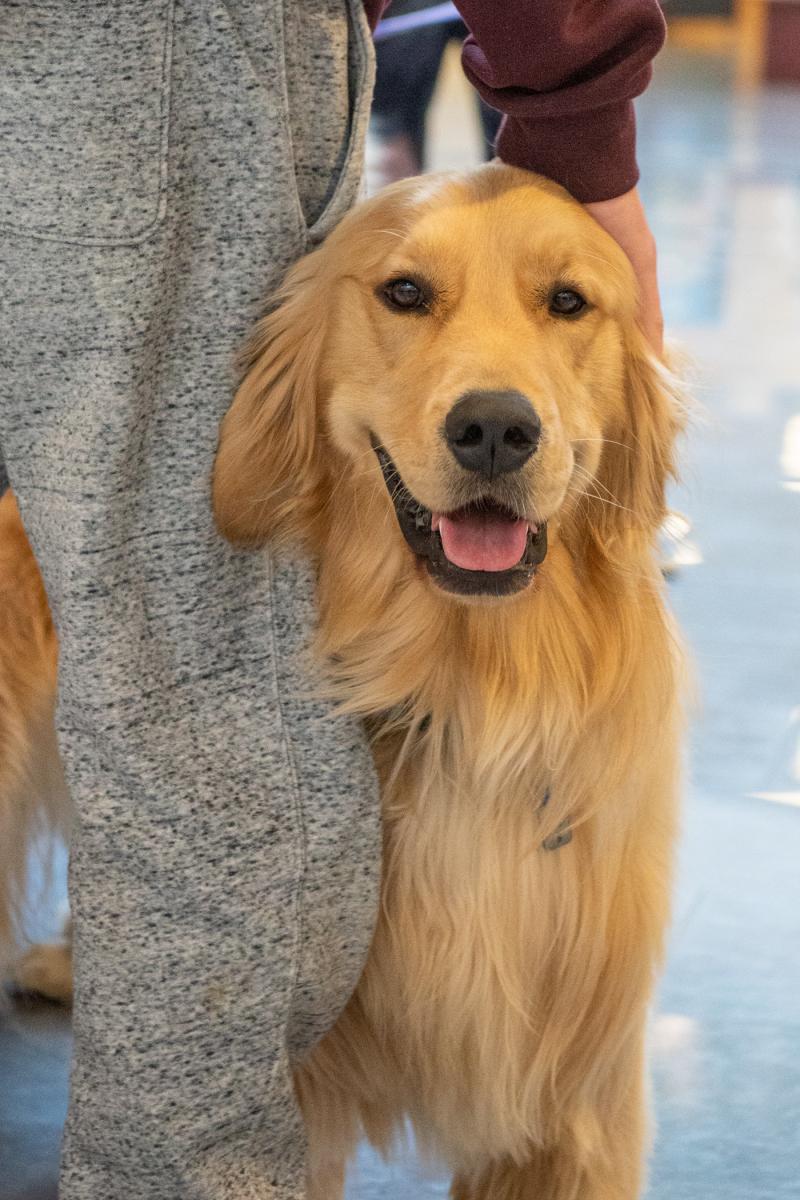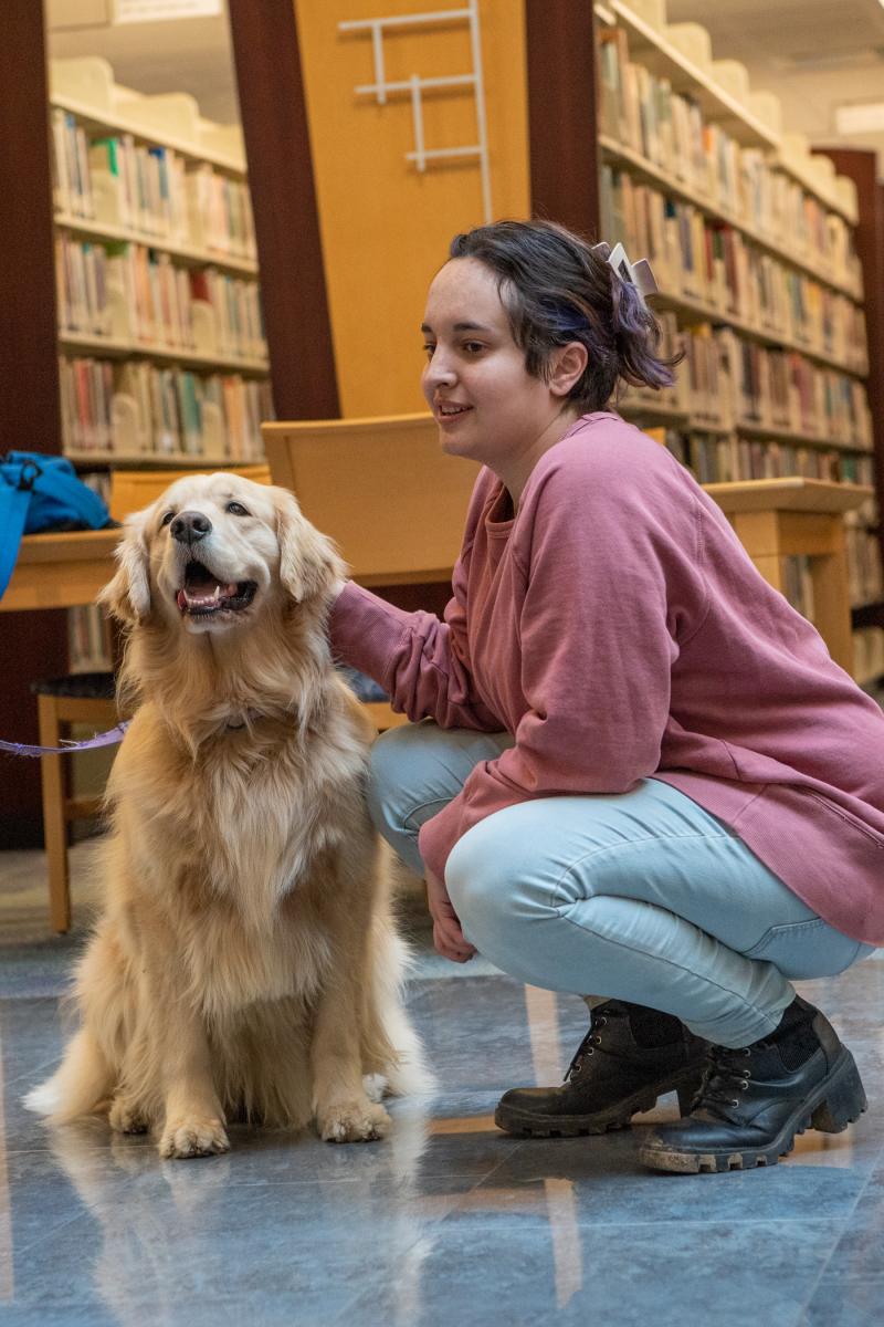 The therapy dogs’ humans, Drew and Tanya Potts, navigate an enthusiastic circle on the library floor. Drew is an assistant professor of civil engineering technology.