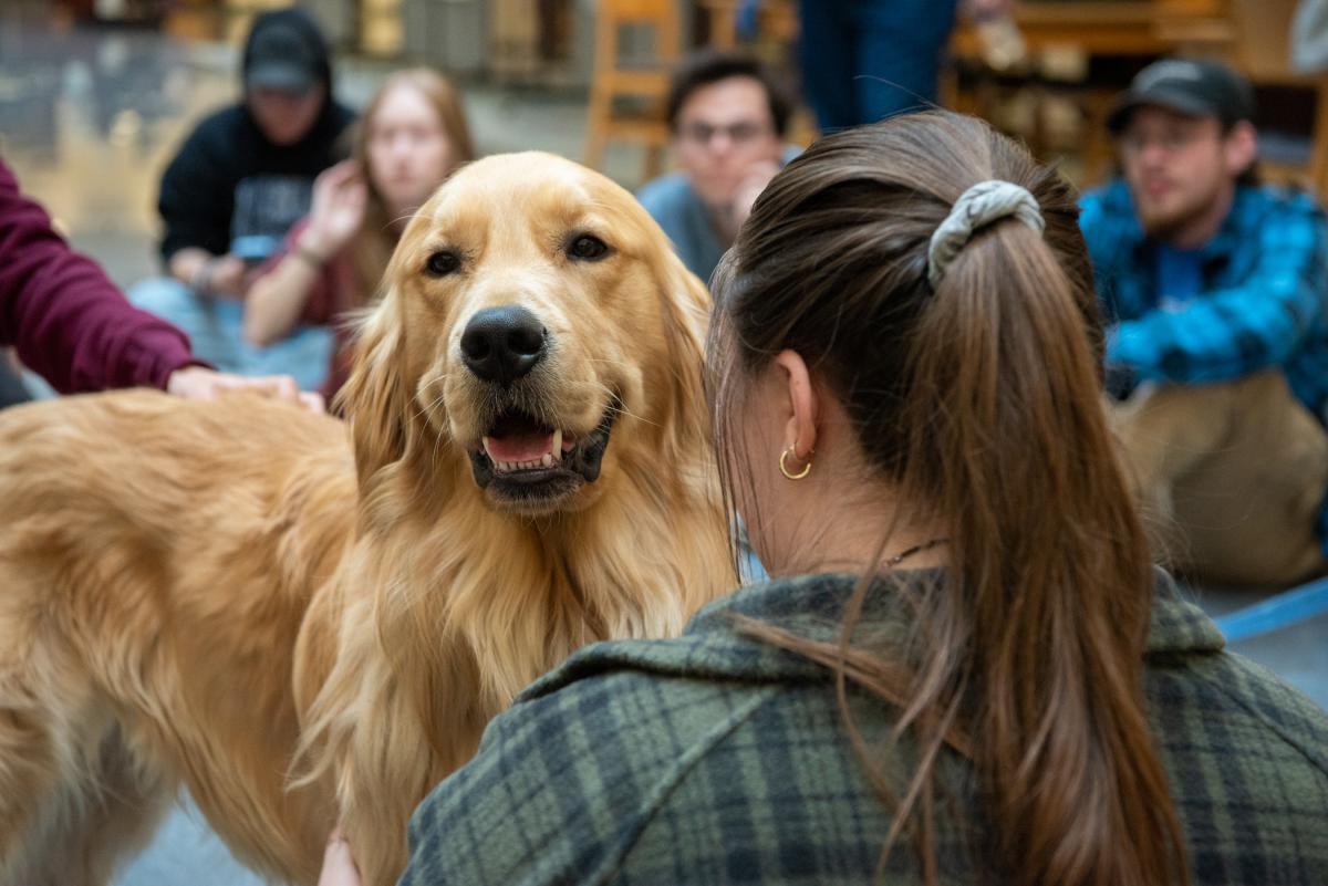 Among the many accommodations that The Madigan Library provides students as they inch ever closer to final exams (comfy chairs, later hours, study rooms for collaborative strategizing), none is as sweet and cuddly as a stress-reduction visit from a pair of therapy dogs. Campus legends after only a relative few years of selfless service, Winnie and Indy continued melting hearts and easing tension during a Wednesday night meetup.