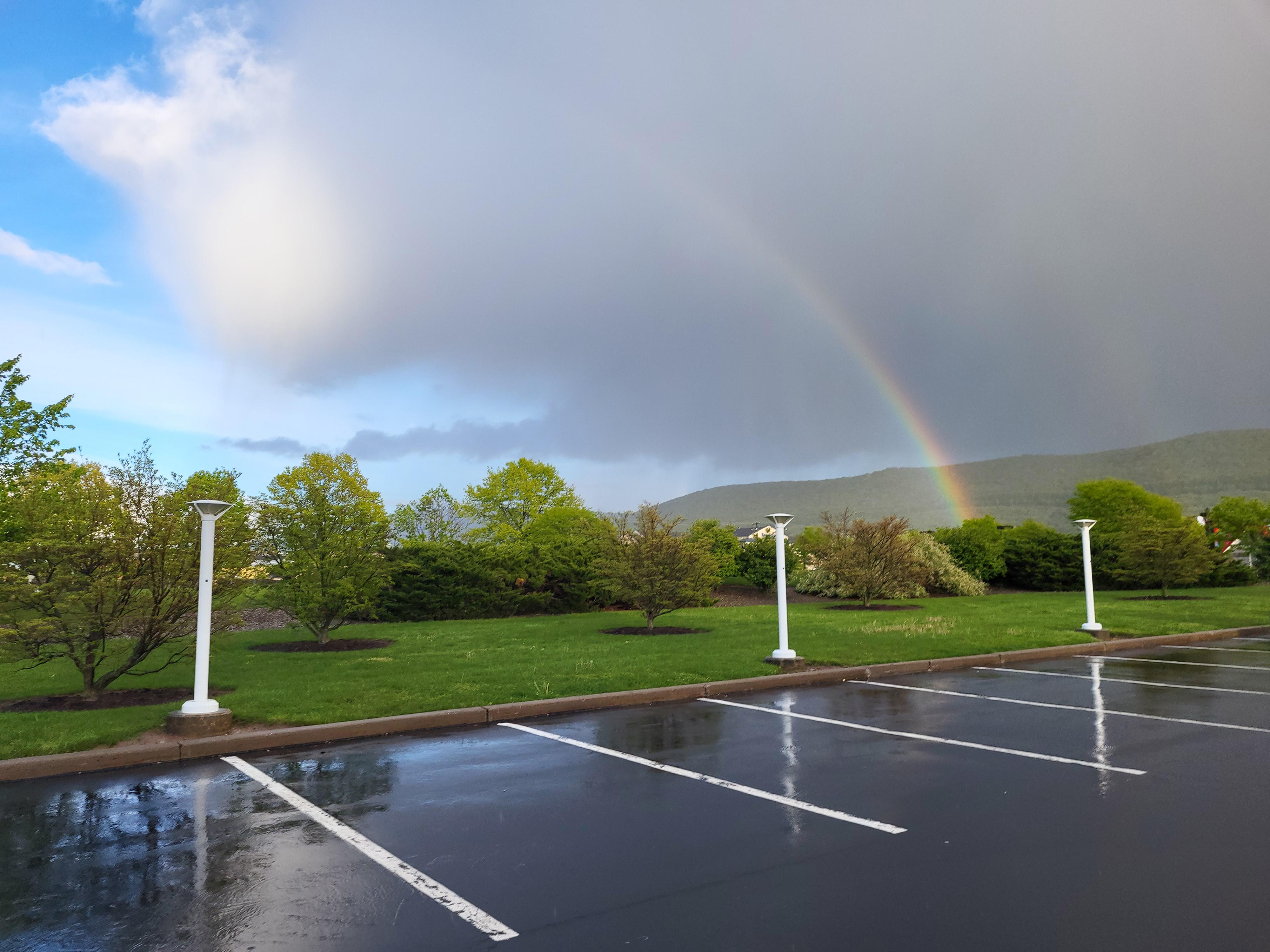 As April showers continued daily into the opening week of May, one could be tempted to wonder if fair weather would ever return. But then ... at 7:04 on a Wednesday evening, let's say ... ... for just a handful of seconds near the rain-glossed Davie Jane Gilmour Center parking lot ... came a sign that storms do pass. And that something beautiful can land smack-dab onto Maynard Street, the gateway to a campus where tomorrows are always bright.
