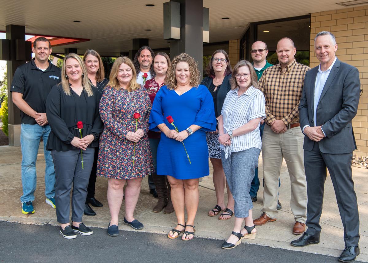 Among those promoted in academic rank for 2023-24, posing with President Reed, are (from left) Robert M. Nolan, business administration/accounting & finance; Elizabeth E. Winder, human services; Tammy A. Miller, biology (general biology and microbiology); Bridget E. Motel, dental hygiene; Craig A. Miller, history/political science; Andrea M. Campbell, English composition and technical communication; Sarah S. Moore, human services; Nicole S. Warner, librarian, archives and special collections; Wendy A. Miller, assistant dean of health sciences; Scott A. Seroskie, electrical technologies; and Robert K. Vlacich, automotive services.