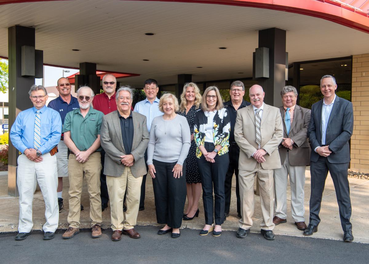 A group of this year's retirees assemble for a presidential photo. From left are Chris E. Miller, William H. Emerick, Dennis R. Dorward, Larry D. Kauffman, Mike J. Ditchfield, William Ma, Michelle Walczak, Barbara K. Emert-Strouse, Karen L. Stugart, Thomas D. Inman, Eric W. Huffman, Marc E. Bridgens and Reed.