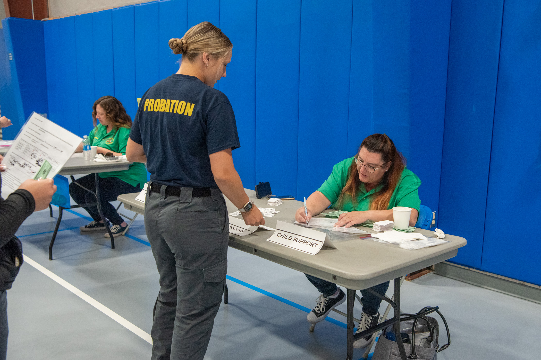 Staged in the spacious Field House, the simulation assigned participants to move through various “stations” addressing challenges clients face, including finding work, housing, transportation and child care; coping with drug and alcohol issues; and juggling parole requirements, among other necessities.